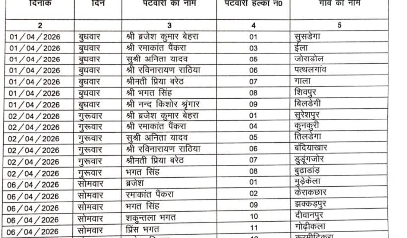 पत्थलगांव।तहसील कार्यालय पत्थलगांव द्वारा राजस्व पखवाड़ा 2026 के अंतर्गत विभिन्न ग्रामों में शिविर आयोजित करने के लिए अधिकारियों एवं कर्मचारियों की ड्यूटी निर्धारित कर दी…