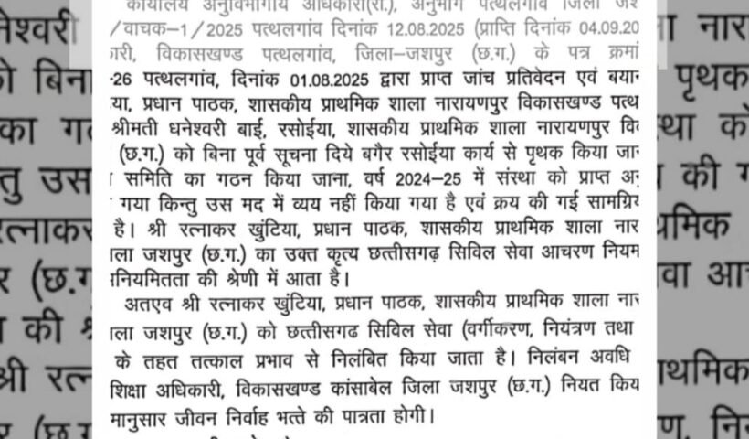 पत्थलगांव। किलकिला के समीप ग्राम नारायणपुर स्थित शासकीय प्राथमिक शाला के प्रधानपाठक रत्नाकर खुटिया के खिलाफ शिकायतों की जांच के बाद निलंबन की कार्रवाई की…