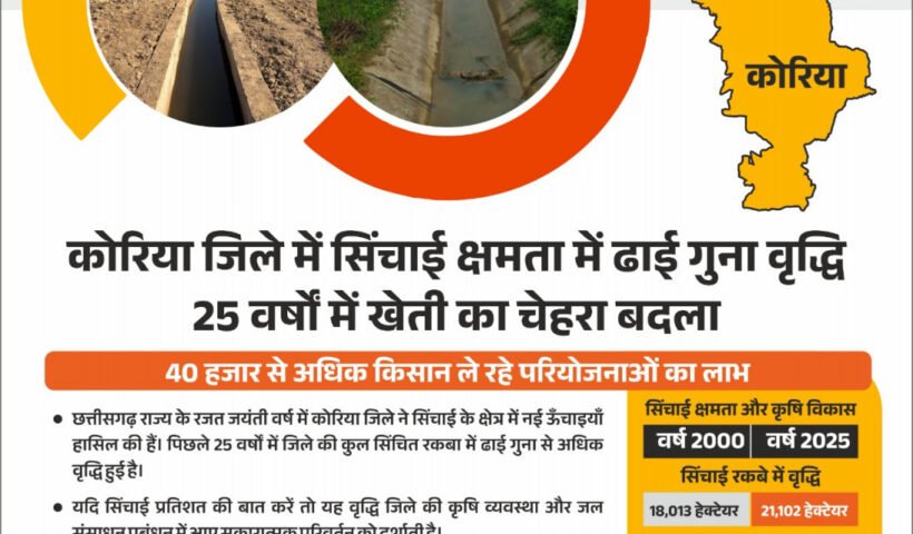 सिंचाई क्षमता में ढाई गुना वृद्धि कोरिया जिले में, 25 वर्षों में खेती का चेहरा बदला रायपुर, छत्तीसगढ़ राज्य के रजत जयंती वर्ष में कोरिया…