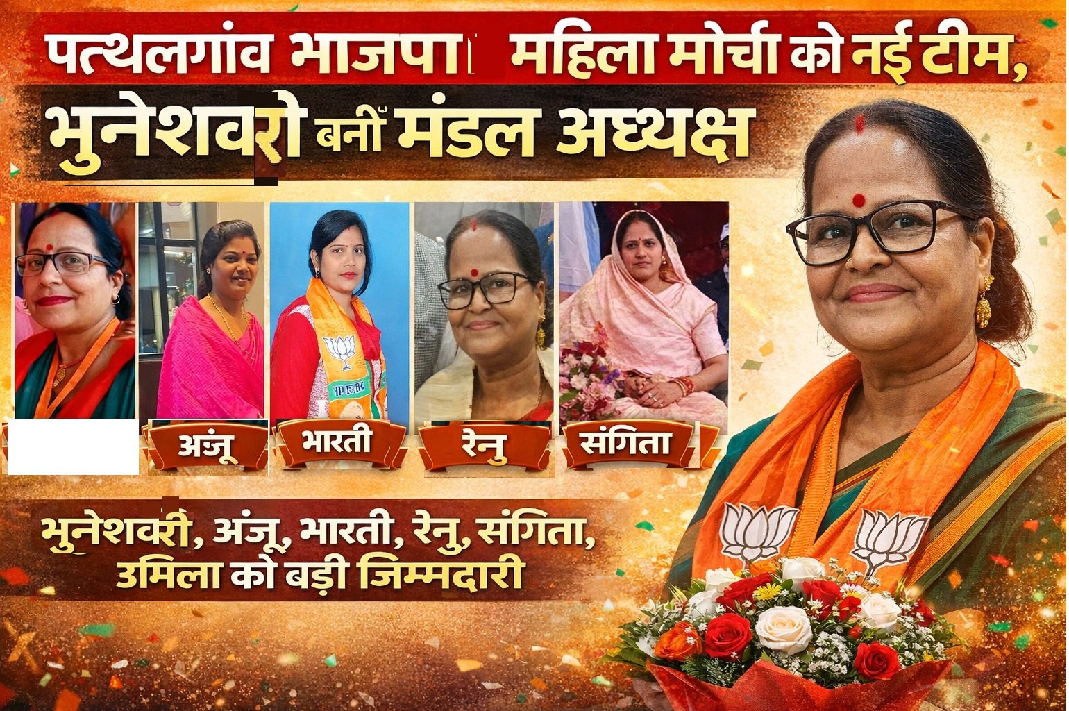 पत्थलगांव में भारतीय जनता पार्टी महिला मोर्चा, जिला जशपुर की नवीन कार्यकारिणी की घोषणा की गई है। इस घोषणा में महिला मोर्चा की सक्रिय कार्यकर्ताओं को महत्वपूर्ण जिम्मेदारियां सौंपी गई हैं, जिससे संगठन को नई मजबूती मिलने की उम्मीद जताई जा रही है।