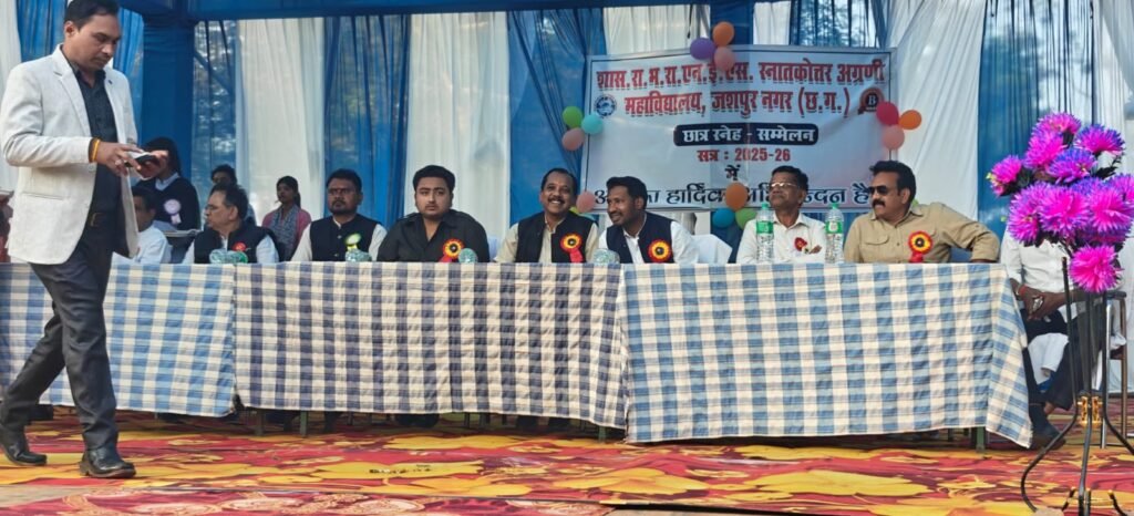 जशपुर | शासकीय एनईएस स्नातकोत्तर महाविद्यालय जशपुर में वार्षिक सम्मेलन एवं छात्र स्नेह सम्मेलन का आयोजन गरिमामय वातावरण में किया गया। कार्यक्रम में जिला पंचायत जशपुर के अध्यक्ष सालिक साय मुख्य अतिथि के रूप में शामिल हुए।विशिष्ट अतिथि के रूप में जिला पंचायत उपाध्यक्ष शौर्य प्रताप सिंह जूदेव, नगर पालिका अध्यक्ष अरविंद भगत, जनपद पंचायत अध्यक्ष गंगा राम भगत उपस्थित रहे।
