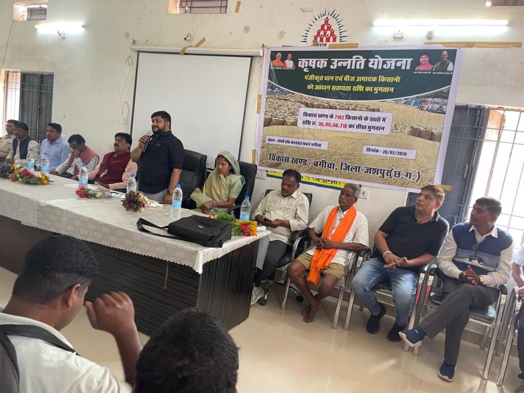 बगीचा (जशपुर)। विकासखंड बगीचा में आयोजित कृषक उन्नति योजना कार्यक्रम में उपाध्यक्ष अरविंद गुप्ता ने कहा कि भाजपा की सरकार किसान हितों को सर्वोच्च प्राथमिकता देते हुए निरंतर कार्य कर रही है। उन्होंने स्पष्ट शब्दों में कहा कि किसानों की मेहनत और पसीने का सम्मान करना ही सरकार का मूल संकल्प है, और इसी भावना के साथ योजनाओं का क्रियान्वयन किया जा रहा है।