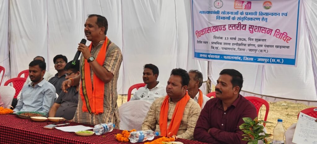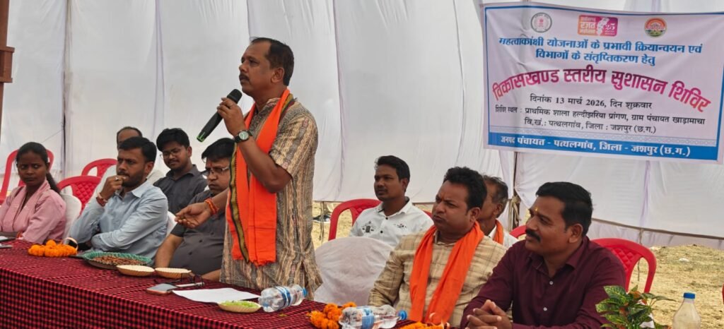 पत्थलगांव।महत्वाकांक्षी योजनाओं के प्रभावी क्रियान्वयन एवं विभिन्न विभागों के संतृप्तिकरण के उद्देश्य से विकासखंड स्तरीय सुशासन शिविर का आयोजन ग्राम पंचायत खाड़ामाचा के हल्दीझरिया में सम्पन्न हुआ। शिविर में क्षेत्र के ग्रामीणों को शासन की योजनाओं की जानकारी दी गई तथा विभिन्न विभागों के माध्यम से समस्याओं का निराकरण भी किया गया।कार्यक्रम में मुख्य अतिथि के रूप में जिला पंचायत जशपुर के अध्यक्ष सालिक साय उपस्थित रहे।