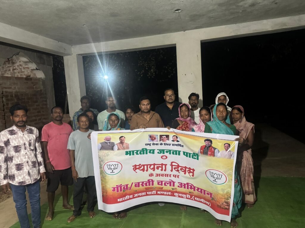 कुनकुरी। भारतीय जनता पार्टी के स्थापना दिवस के अवसर पर “गांव चलो, बस्ती चलो अभियान” के तहत कुनकुरी ग्रामीण मंडल के अंबाचुआ बूथ में कार्यक्रम आयोजित किया गया। कार्यक्रम में पार्टी कार्यकर्ताओं ने ग्रामीणों के बीच पहुंचकर भाजपा की रीति-नीति, विचारधारा और केंद्र व राज्य सरकार की जनकल्याणकारी योजनाओं की जानकारी दी।