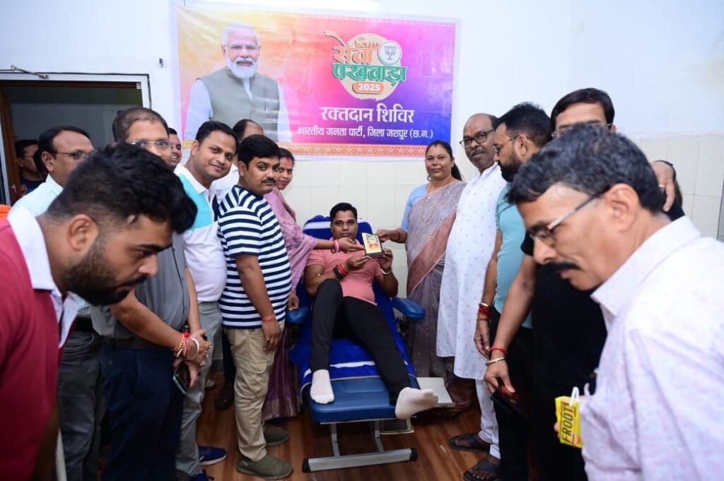 पत्थलगांव। प्रधानमंत्री नरेंद्र मोदी के जन्मदिवस अवसर पर पूरे देशभर में चल रहे सेवा पखवाड़ा अभियान के अंतर्गत मंगलवार को भारतीय जनता पार्टी मंडल पत्थलगांव शहर द्वारा जिला स्तरीय विशाल रक्तदान शिविर का आयोजन किया गया। शिविर का शुभारंभ सरगुजा क्षेत्र आदिवासी विकास प्राधिकरण की उपाध्यक्ष एवं विधायक श्रीमती गोमती साय ने किया।शिविर का उद्घाटन करने के बाद विधायक श्रीमती साय ने अस्पताल में भर्ती मरीजों को फल वितरण कर उनके स्वास्थ्य लाभ की कामना की।