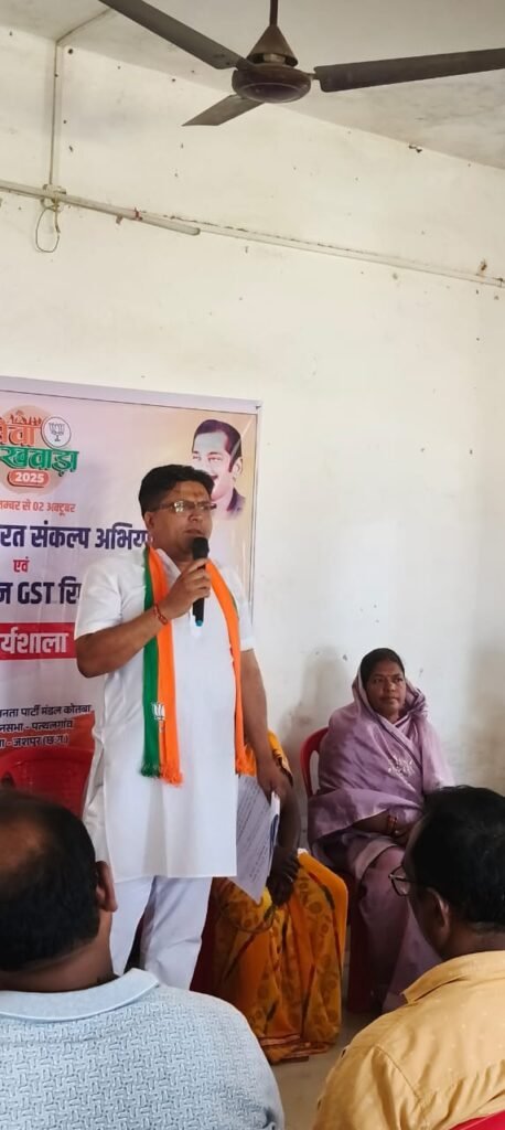 कोतबा। कोतबा मंडल में जीएसटी बचत उत्सव एवं आत्मनिर्भर भारत अभियान कार्यक्रम का भव्य आयोजन किया गया, जिसमें जिला महामंत्री मनीष अग्रवाल विशेष रूप से शामिल हुए।प्रधानमंत्री श्री नरेंद्र मोदी के मार्गदर्शन में चल रहे ऐतिहासिक #NextGenGST सुधारों की जानकारी जन-जन तक पहुँचाने के उद्देश्य से यह कार्यक्रम आयोजित किया गया। सेवा पखवाड़ा के अंतर्गत व्यापारियों एवं उपभोक्ताओं से भेंटकर उन्हें केंद्र सरकार द्वारा जीएसटी में किए गए महत्वपूर्ण परिवर्तन और उनके लाभ के बारे में अवगत कराया गया।