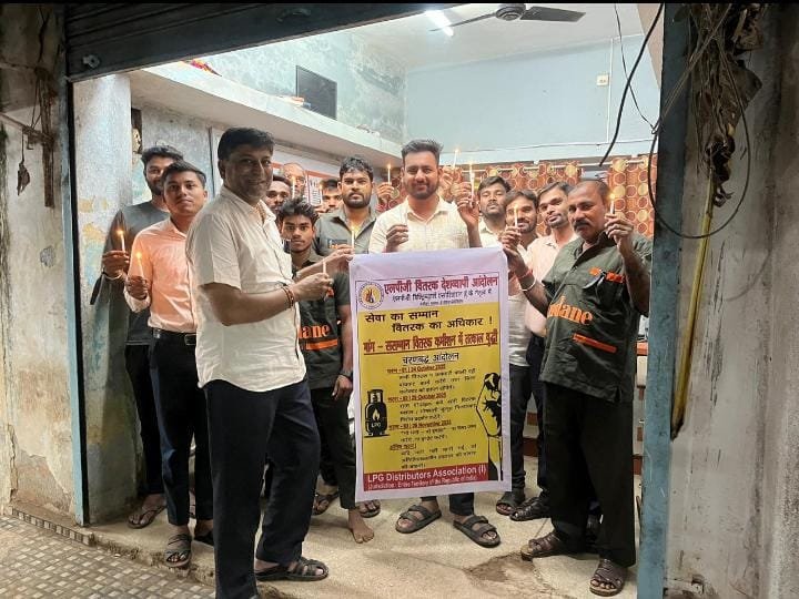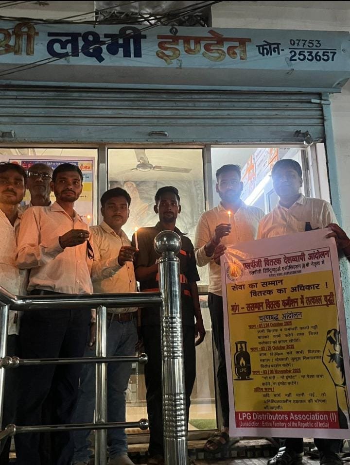 दिनांक:-30/10/2025**मोहम्मद जावेद खान हरित छत्तीसगढ।।**करगीरोड-कोटा:-एलपीजी-डीलर-एसोसिएशन (इंडिया) के तत्वावधान में बिलासपुर-जिले के सभी एलपीजी वितरकों ने अपने कर्मचारियों के साथ 29- अक्टूबर को शाम 07-बजे हाथों में काली पट्टी बांधकर मोमबत्ती जलाकर कमीशन वृद्धि के समर्थन में शांतिपूर्ण प्रदर्शन किया।**इसी कड़ी में कोटा एलपीजी वितरक अतुल अग्रवाल ने भी अपने कर्मचारियों के साथ मिलकर एकसूत्रीय मांग के समर्थन में शांतिपूर्ण प्रदर्शन किया.