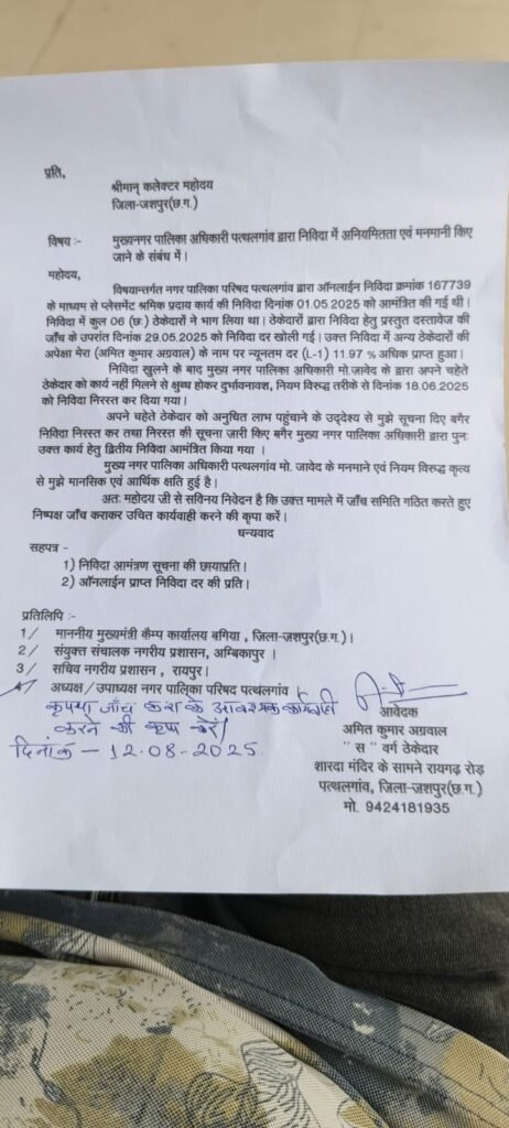 पत्थलगांव। नगर पालिका परिषद पत्थलगांव के प्लेसमेंट ठेका को लेकर उठे विवाद ने अब तूल पकड़ लिया है। मामला हाईकोर्ट तक पहुँच गया है।जानकारी के अनुसार, नगर पालिका द्वारा प्लेसमेंट श्रमिक प्रदाय कार्य के लिए ऑनलाईन निविदा आमंत्रित की गई थी। यह निविदा 01 मई 2025 को जारी की गई, जिसमें कुल 6 ठेकेदारों ने भाग लिया। दस्तावेजों की जाँच उपरांत 29 मई 2025 को निविदा दर खोली गई। इसमें ठेकेदार अमित कुमार अग्रवाल की दर न्यूनतम पाई गई, जिसके आधार पर ठेका उन्हें मिलना तय था।लेकिन निविदा खुलने के बाद नगर पालिका ने उसे निरस्त कर दिया।