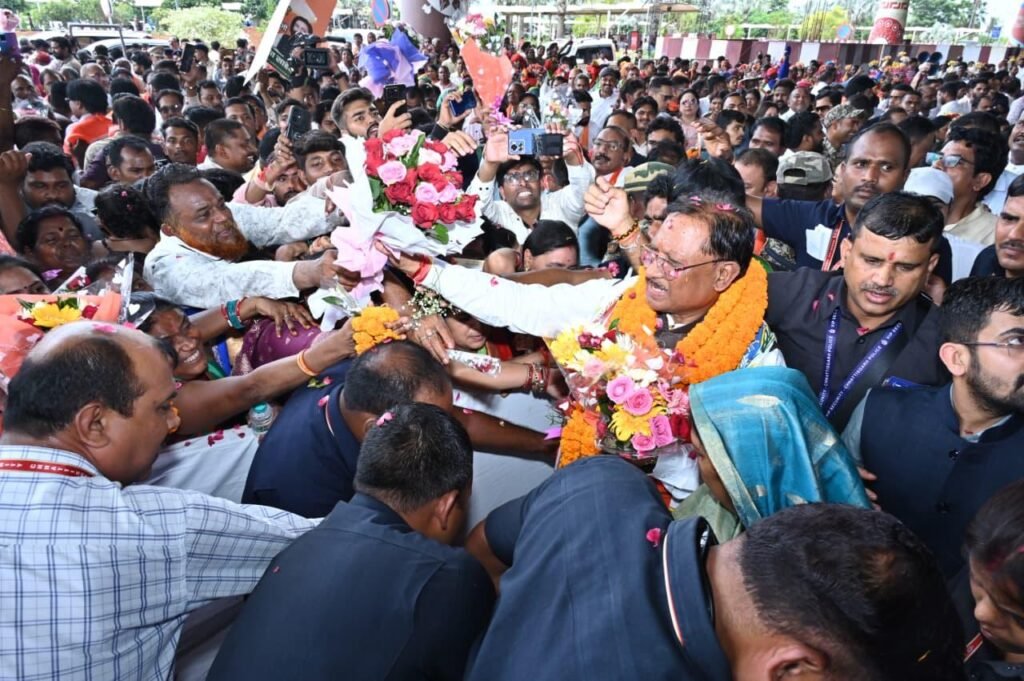 रायपुर, 30 अगस्त 2025/ अपनी आठ दिन के जापान और दक्षिण कोरिया के विदेश दौरे के बाद आज मुख्यमंत्री श्री विष्णु देव साय वापस रायपुर लौटे हैं। श्री साय के वापस लौटने पर आज एयरपोर्ट पर उनका भव्य स्वागत किया गया। छत्तीसगढ़ के पारंपरिक कर्मा और पंथी नृत्यों से पूरा एयरपोर्ट परिसर लगभग एक घंटे तक सराबोर रहा। लोगों की बड़ी संख्या में मौजूदगी ने मुख्यमंत्री श्री साय की लोकप्रियता और उनके विदेश दौरे की सफलता को स्वयं ही बयां कर दिया। मुख्यमंत्री का पुष्प गुच्छों से लेकर गजमाला तक से स्वागत किया गया। एयरपोर्ट के निकास द्वार से मीडिया गैलेरी तक लगभग 100 मीटर की दूरी तय करने में श्री साय को लगभग 15 मिनट लगे।