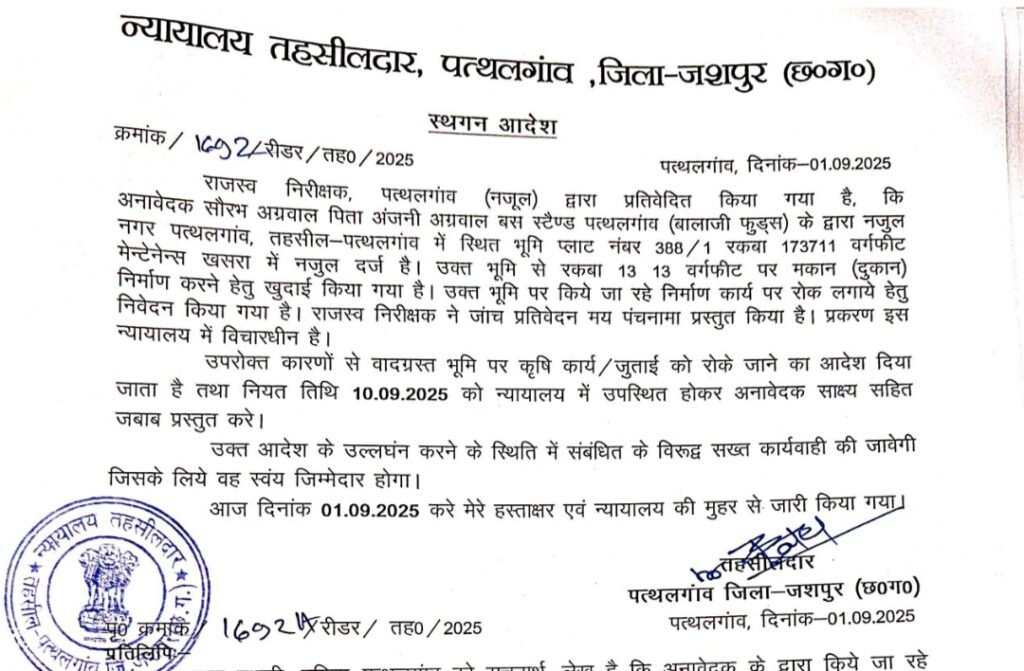 पत्थलगांव। नगर के बस स्टैंड क्षेत्र में शासकीय ज़मीन पर अवैध निर्माण और कब्ज़े का मामला लगातार गहराता जा रहा है। ताज़ा घटनाक्रम में जनपद पंचायत परिसर स्थित शौचालय और कार्यालय क्षेत्र पर होटल विस्तार हेतु हो रहे निर्माण कार्य पर प्रशासन ने रोक लगा दी है।मिली जानकारी के अनुसार, राजस्व विभाग (नजूल) की रिपोर्ट के आधार पर इस निर्माण पर तत्काल रोक का आदेश जारी किया गया है।