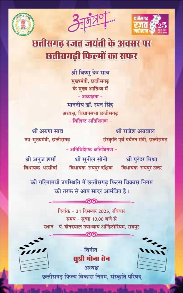 छत्तीसगढ़ी फिल्मों के सफर का यह छत्तीसगढ़ रजत जयंती का सुभावसर है, जब छत्तीसगढ़ के मुखिया मुख्यमंत्री विष्णुदेव साय के नेतृत्व में छत्तीसगढ़ फिल्म विकास निगम, संस्कृति परिषद द्वारा 21 दिसंबर को सुबह 10 बजे पं. दीनदयाल उपाध्याय ऑडिटोरियम,रायपुर में आयोजित होगा। कार्यक्रम की अध्यक्षता विधानसभा अध्यक्ष डॉ. रमनसिंह करेंगे। इस कार्यक्रम में अन्य प्रमुख अतिथियों में उप-मुख्यमंत्री अरूण साव, संस्कृति एवं पर्यटन मंत्री राजेश अग्रवाल, धरसींवा विधायक अनुज शर्मा, रायपुर पश्चिम विधायक सुनील सोनी, रायपुर उत्तर विधायक पुरंदर मिश्रा सहित छत्तीसगढ़ी सिनेमा से जुड़े कलाकार एवं टेक्नशियन उपस्थित रहेंगे।
