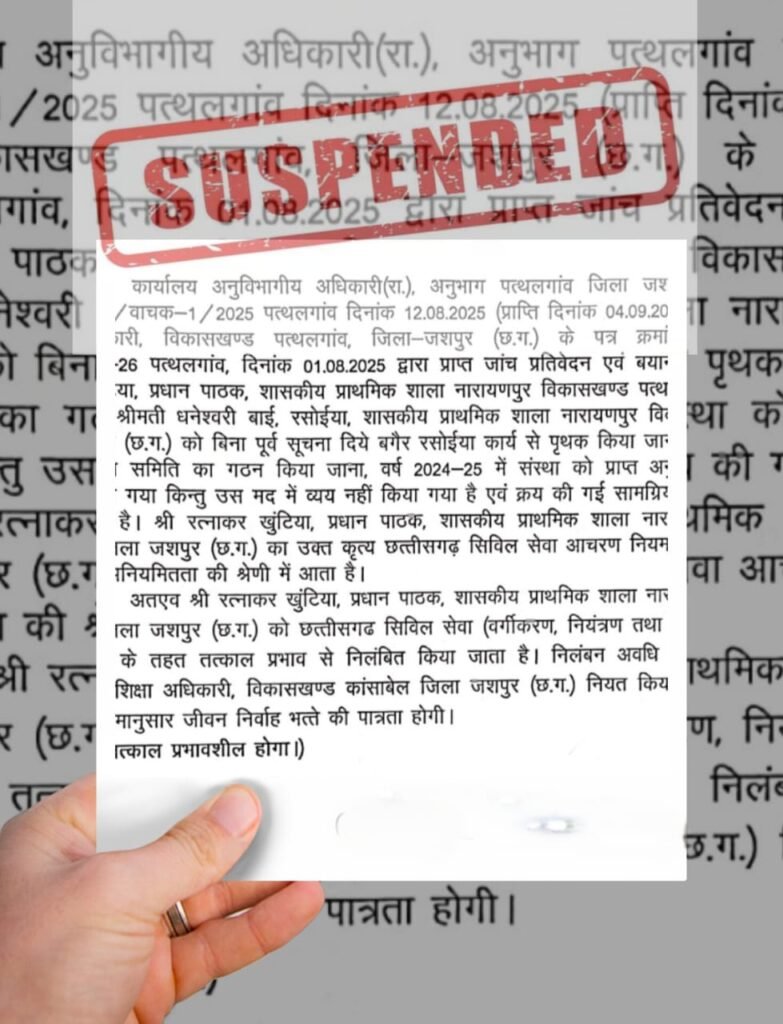वही प्रधानपाठक के खिलाफ चले विभागीय जांच में पाया गया कि प्रधानपाठक ने रसोइया को बिना पूर्व सूचना कार्य से अलग कर दिया था, शाला विकास समिति का मनमाने तरीके से गठन किया गया था, संस्था को वर्ष 2024-25 में प्राप्त अनुदान राशि का उपयोग नियमों के अनुरूप नहीं किया गया तथा खरीदी गई सामग्रियों की प्रविष्टि स्टॉक पंजी में दर्ज नहीं की गई। यह कृत्य छत्तीसगढ़ सिविल सेवा आचरण नियम एवं वित्तीय अनियमितता की श्रेणी में आता है। रत्नाकर खुटिया को छत्तीसगढ़ सिविल सेवा नियम के अंतर्गत तत्काल प्रभाव से निलंबित किया गया है। निलंबन अवधि में उनका मुख्यालय विकासखण्ड शिक्षा अधिकारी कार्यालय, कांसाबेल नियत किया गया है तथा उन्हें नियमानुसार जीवन निर्वाह भत्ता मिलेगा।