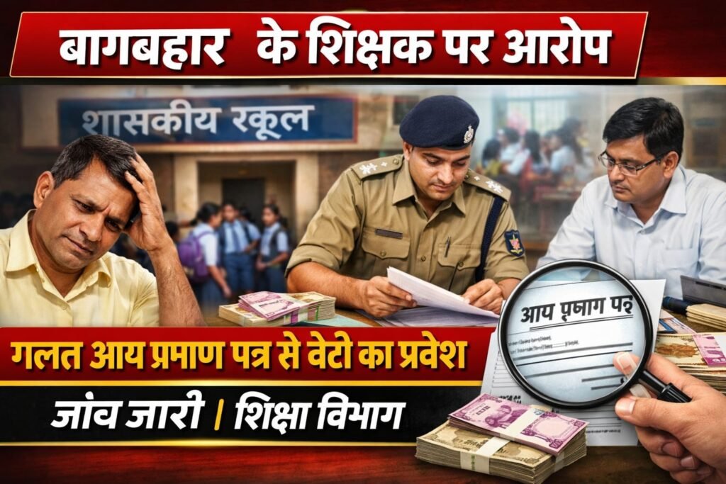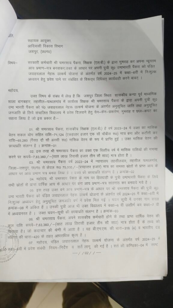 पत्थलगांव (जशपुर)। शासकीय कन्या पूर्व माध्यमिक शाला बागबहार में पदस्थ शिक्षक चमरसाय पैकरा पर अपनी पुत्री कु० उमा भारती पैकरा को पंडित जवाहरलाल नेहरू उत्कर्ष योजना के अंतर्गत संचालित अनुसूचित जाति एवं अनुसूचित जनजाति विद्यालय में गलत आय प्रमाण पत्र के आधार पर प्रवेश दिलाने का गंभीर आरोप लगा है। इस संबंध में एक संगठन द्वारा विस्तृत शिकायत दर्ज कराई गई है।शिकायत में बताया गया है कि चमरसाय पैकरा, शासकीय शिक्षक (एल.बी.) हैं। वर्ष 2023–24 में उनका मासिक सकल वेतन के आधार पर उनकी वार्षिक आय लगभग सात लाख तिरासी हजार तीन सौ साठ रुपये होती है।
