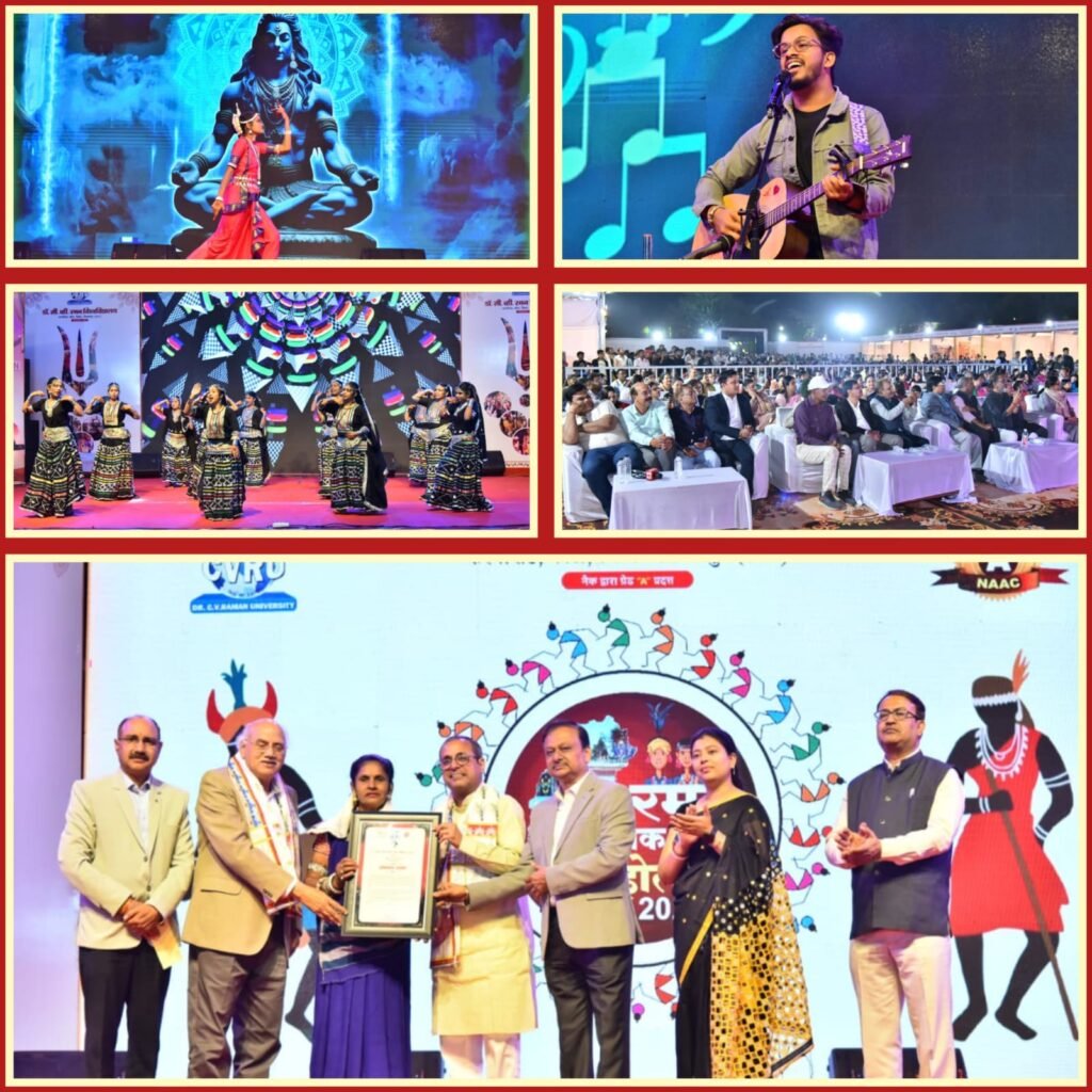 वही अतिथि के रूप में उपस्थित बिलासपुर के पूर्व विधायक व डॉ.सीवी रमन-विश्वविद्यालय के पूर्व रजिस्टर रहे शैलेश पांडे ने कहा कि कहा कि डॉ.सीवी रमन विश्वविद्यालय शिक्षा संस्कृत भाषा-तकनीक सहित विभिन्न क्षेत्र में काम करने वाला एकमात्र विश्वविद्यालय है..जिसके पास इस तरह की समग्रता है..किसी भी संस्थान का विकास उसके शैक्षणिक विविधता और समग्रता से ही सुनिश्चित होता है..उन्होंने विश्वविद्यालय के प्रगति की कामना की इस अवसर पर विश्वविद्यालय के कुलपति प्रोफेसर प्रदीप कुमार घोष वैशाली विश्वविद्यालय के कुलपति प्रोफेसर समित तिवारी, कुलसचिव डॉक्टर अरविंद कुमार तिवारी संकुलपति डॉक्टर जयंती चटर्जी उपस्थित थे।**प्रसिद्ध त्योहार गायिका रेखा देवार को शारदा चौबे लोककला से सम्मानित हुई:—**प्रतिवर्ष रमन-लोककला महोत्सव में प्रदान किए जाने वाला शारदा चौबे लोककला सम्मान इस बार प्रसिद्ध त्योहार गायिका रेखा देवार को प्रदान किया गया..उन्हें सम्मान पत्र के साथ नगद राशि पुरस्कार किया गया।**पद्म-संवाद में पद्म-सम्मानित विभूतियों ने साझा किए संघर्ष:–**लोक कला संरक्षण, साधना और समाज सेवा की प्रेरक गाथाएँ महोत्सव के समानांतर सत्र में पद्म संवाद का आयोजन किया गया, जिसमें छत्तीसगढ़ की पद्म सम्मानित विभूतियों ने अपने जीवन अनुभव और संघर्षों को साझा किया..छत्तीसगढ़ की लोक कला एवं संस्कृति के संरक्षण में विशिष्ट योगदान के लिए पद्मश्री से अलंकृत रामलाल बैरेट ने कहा कि उन्हें जो भी उपलब्धि मिली है..वह गुरुकृपा का परिणाम है..उन्होंने महाराजा चक्रधर से कथक सीखने की अपनी यात्रा को याद करते हुए कहा कि सीखने की कोई उम्र नहीं होती..वे पाँच वर्ष की आयु से सीख रहे हैं..और आज भी सिखा रहे हैं..आदिवासी लोककला और सांस्कृतिक विरासत के संरक्षण व प्रचार प्रसार के लिए पद्मश्री से सम्मानित अजय मांडवी ने स्वयं को एक साधारण कलाकार बताते हुए कहा कि शांति और धैर्य ही सफलता की दिशा तय करते हैं.. वे पिछले 16 वर्षों से जेलों में कार्य कर मुख्यधारा में लौटने वाले नक्सल प्रभावित लोगों को कला के माध्यम से नई राह दिखा रहे हैं उनका मानना है,कि सकारात्मक कार्य कई गुना होकर समाज में लौटता है..बिरहोर और पहाड़ी कोरबा जनजातियों के उत्थान के लिए समर्पित जागेश्वर यादव ने बताया कि निरंतर प्रयासों से आज बड़ी संख्या में परिवारों को स्थायी आवास मिल सका है..उन्होंने कहा कि अभी भी शिक्षा और रोजगार के क्षेत्र में लंबा रास्ता तय करना है पर जब तक जीवन है..वे सेवा करते रहेंगे..पद्मश्री राधेश्याम बारले ने भी अपने अनुभव साझा करते हुए लोक कला के प्रति अपनी निस्वार्थ-साधना और समर्पण को व्यक्त किया..कार्यक्रम का संचालन डॉ.ब्रह्मेश श्रीवास्तव ने किया।**छ